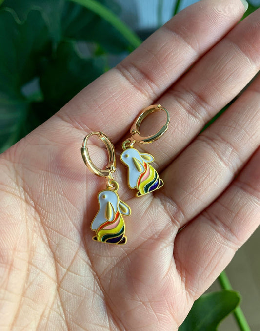 Unique Rainbow Bunny Huggie Hoop Earrings